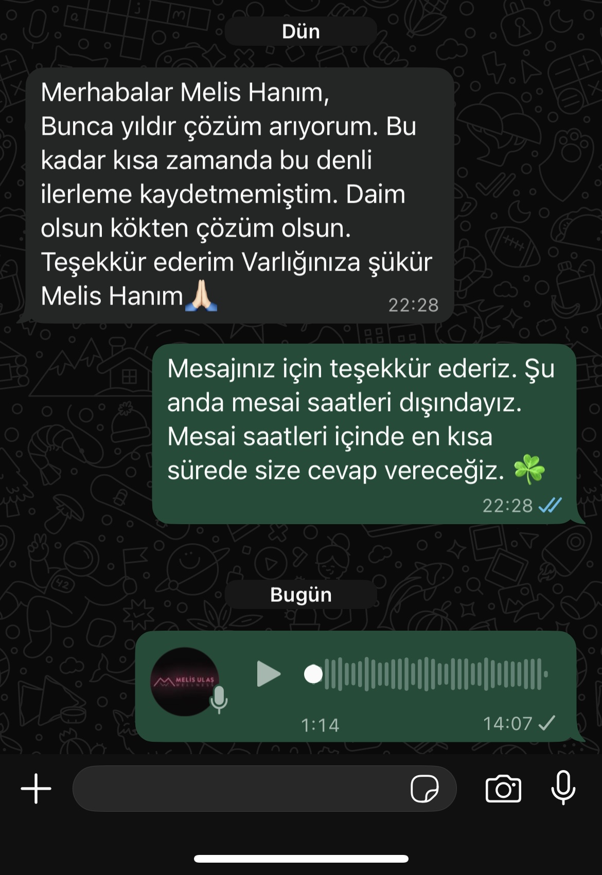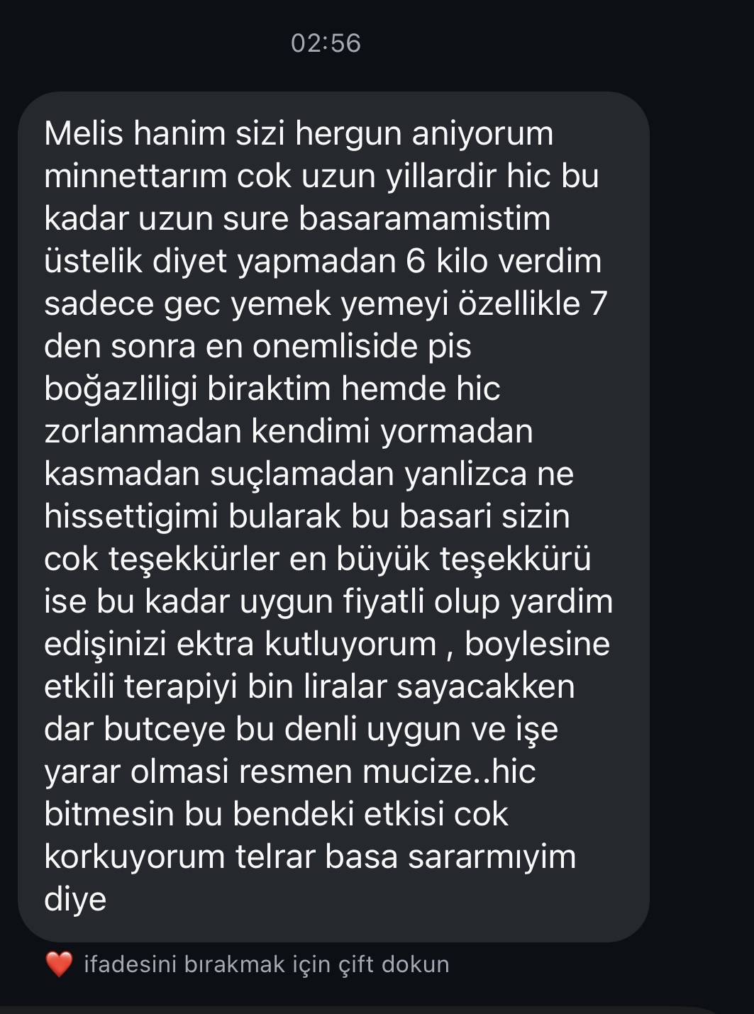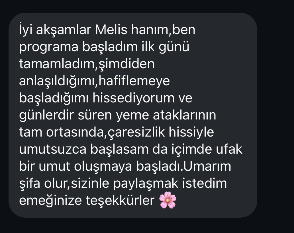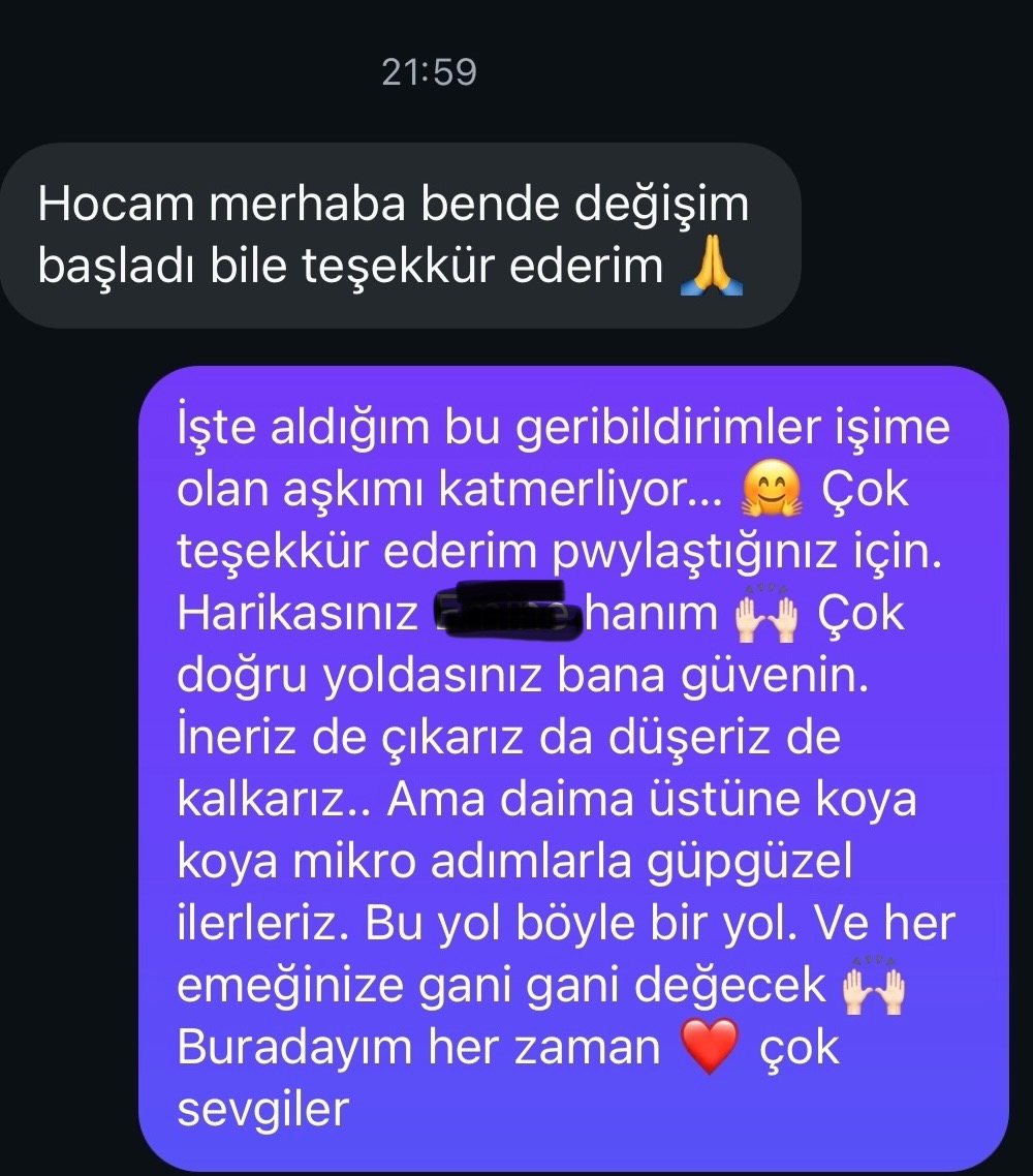 "Melis'le çalışmak ilk günden itibaren çok farklı bir yolculuk oldu benim için. Melis'in tüm samimi ve içten yaklaşımı ile beni gerçekten anladığını hissettikçe kendimi açabildim ve aldığım ipuçlarını uyguladıkça yaşamımdaki farklılıkları hissetmeye başladım."